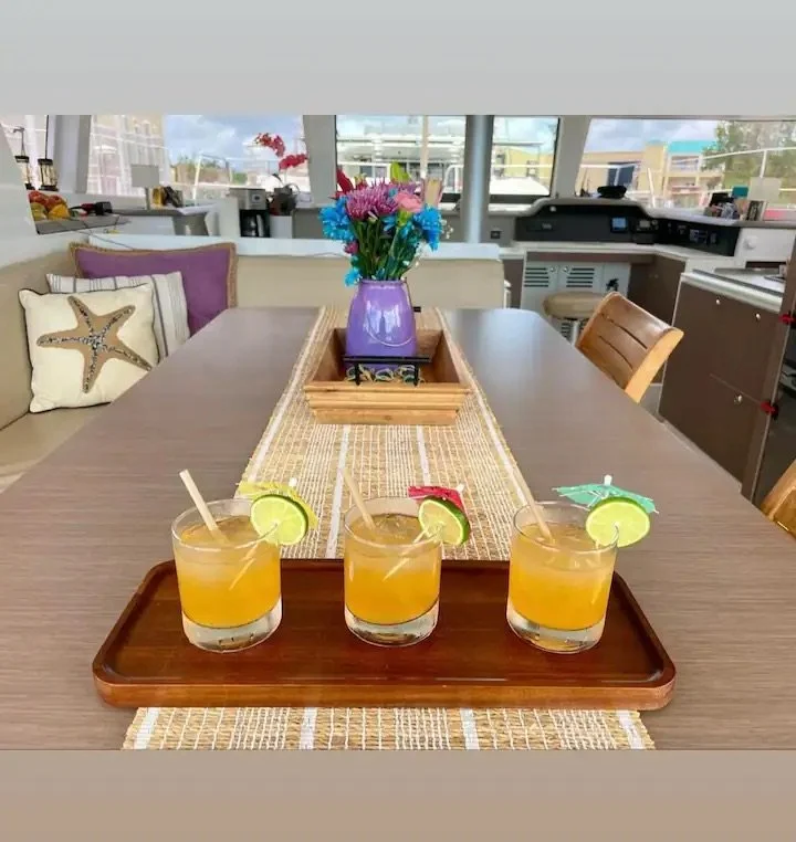 Enjoy all the comforts of home, including 4 luxurious staterooms with queen sized beds, each with its own private bathroom, a full galley (kitchen) with everything needed for on-board meal prep, and a comfortable salon that opens to the large, covered patio.